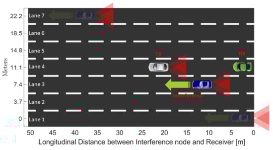 The intended transmitter (white vehicle) and the receiver (green vehicle) are driving in the middle lane (lane 4) with an inter-vehicular distance of 18 m. We consider that the vehicles are travelling at a similar speed, the situation being almost a platoon configuration. The Doppler effect is then neglected. The distance corresponds to a reasonable braking distance for an autonomous vehicle at a speed of 50 km/h [21,22,23,24]. The third interfering vehicle is added (blue vehicle), to evaluate the impact of its signal emitted on the communication between the intended transmitter and the receiver depending on the position of the interfering vehicle.