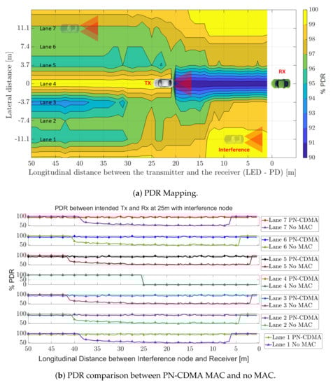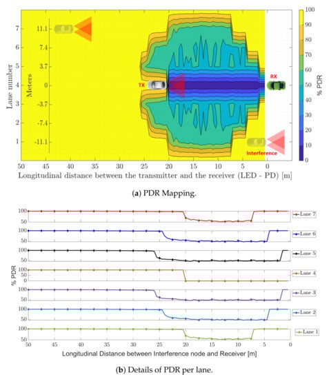 (a) View of PDR performance from above with MUI (blue vehicle) in V2V VLC without MAC, when transmitter (gray vehicle) and receiver (green vehicle) are in lane 4 of a seven-lane road with an inter-vehicle distance of 20 m; (b) Details of PDR performance.