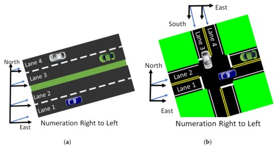 We assume that individual vehicles, particularly automated vehicles, are aware of their positions and the road lane (i.e., the lane id) [27]. As illustrated in Figure 7, individual lanes have distinct identifications.