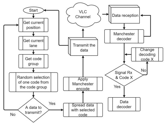 Figure 8 depicts the proposed MAC protocol. To transmit a packet using VLC, the vehicle first identifies its position and the lane ID. Then randomly selects one code from the code group assigned to that specific lane. Individual cars, mainly automated vehicles, are supposed to be aware of their positions and the road lane (lane id) [27,28].