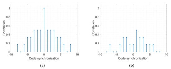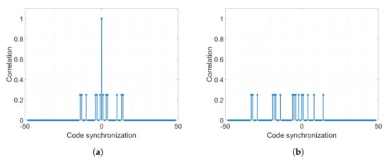 The OOC codes are constructed using chips (0’s, 1’s) of length n and weight w, with the constraints that they must be orthogonal. In 1989, the authors in [29,30] outlined the main properties and mathematics behind the design of OOC. These properties are auto-correlation and cross-correlation. To distinguish one code from another, the auto-correlation of each one must exhibit impulse behaviour (see Figure 9a). Conversely, cross-correlation between different codes must have a much smaller value, close to zero (see Figure 9b).