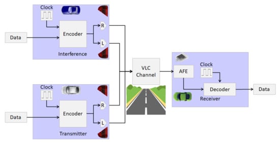 Much of the research efforts in VLC have focused more particularly on designing the physical layer (PHY). Indeed, IEEE 802.15.7 [1] and 802.15.7r1 [2] standards define three types of physical layer, PHY-I, PHY- II, and PHY-III, where PHY-I is for outdoor applications. A VLC system with PHY-I provides ON–OFF keying (OOK) and variable pulse position modulation (VPPM) functionalities. It was developed for outdoor applications with data rates in the tens to hundreds of kbps. Numerous studies have demonstrated the feasibility of VLC for V2V communications. The authors in [3,4,5,6] demonstrated the feasibility of VLC for V2V and V2I (Vehicle-to-Infrastructure) communication at distances of between 20 and 130 m and data rates of 11 to 500 kbps.