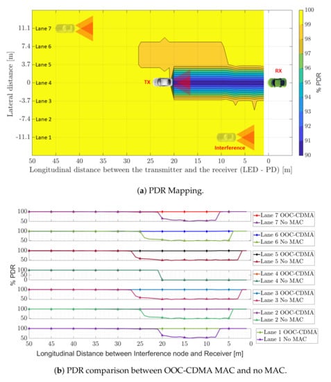 (a) PDR performances view from the top in presence of MUI on V2V VLC with OOC-OCDMA MAC, when transmitter and receiver are on the center lane of a seven-lane road at 18 m between them; (b) Details for PDR performances.