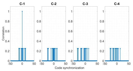 Figure 9 and Figure 10 show the correlation properties of the two types of code. First of all, the auto-correlation and cross-correlation of the OOC codes always remain below , except when the auto-correlation is synchronized (). Consequently, OOC codes should perform well if the signals are synchronised. In contrast, for PN codes the correlation does not always have the same value. If the auto-correlation values are greater than the cross-correlation values, the PN codes can be detected in the case of asynchronous transmission which can be very useful in our case.