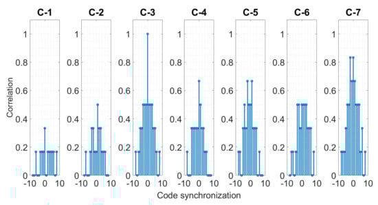 PN code 3 was allocated to the intended transmitter in lane 4. The correlation properties of this code with the other codes are presented in Figure 15. Compared with the case of OOC (Figure 13), some noise is observed, with peaks even for cross-correlation with another code, e.g., with code 7. Nevertheless, the proposed MAC protocol with PN codes shows a sufficiently high PDR () for all the lanes in the target scenario. However, we observed some fluctuations, particularly when the interfering vehicle was in lane 3, due to the cross-correlation properties of the codes.