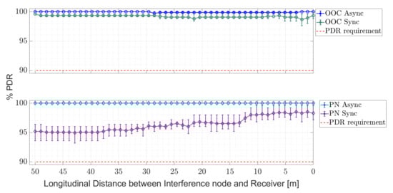 The most critical impact of the interference vehicle is on the adjacent lane to the intended transmitter and receiver. Thus, the following results are only a two lanes scenario with the intended Tx and Rx placed in one lane. The interference vehicle changes its position along the adjacent lane as in the previous simulations. Figure 16 demonstrates that the PDR performance of the protocols does not decrease less than 90% when asynchronous OOC and PN codes are used. We can see that when the code is not synchronized with the intended emitter, the impact of the interference is reduced for both codes resulting in PDR performances over 99%.