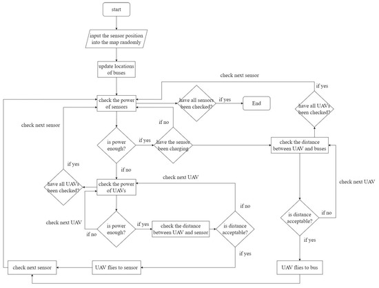 In this study, three charging schemes were analyzed: naïve charging, shortest path charging, and max power charging. The naïve charging is intuitive. In this charging scheme, a UAV checks the location of the bus every 30 s. When the bus is near the sensor that lacks power, a UAV that has sufficient power flies from the bus to the charging point of the sensor. Once the sensors are charged, the UAV flies back to the bus if the bus is within the flight distance limit and is recharged by the bus. In naïve charging, the flight path of the UAV may not be the shortest because it directly flies to the sensors lacking power. It does not consider the distance between the location of the bus and the sensor. Table 2 explains the symbols used in this study. The flow chart of the charging process is shown in Figure 1. It will be adjusted according to the charging schemes. The operation of the naïve charging strategy is presented in Algorithm 1.
