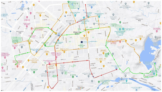 In this study, we used the bus routes and the bus timetables in Chiayi city and the street map from Google Maps in the simulation experiment, as shown in Figure 2. Chiayi city has three routes. We simplified the names of the routes to green, red, and orange routes. The time intervals between each bus on the three routes are 30, 40, and 60 min, and the running times are 53, 45, and 56 min, respectively. For convenience, we fixed the bus speed and did not consider the basic consumption for running of UAV. We simulated these algorithms via python. We updated the bus location and the status of sensors and UAVs every 30 s and analyzed the performance of the sensors under each algorithm.