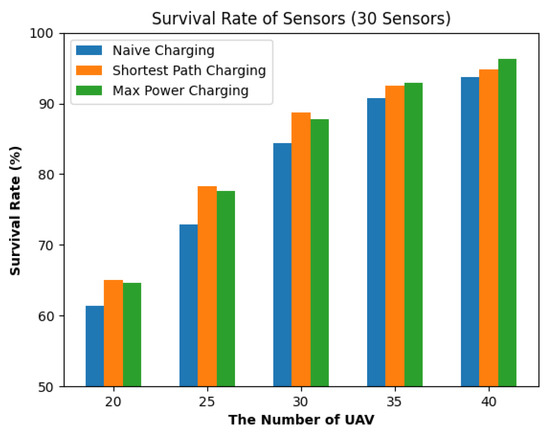 In this study, we simulated the operation time of buses for 10 h in real life. We tested several times for the results. First, we compared the survival rate of sensors with the three algorithms. Figure 3 shows the impact of the different algorithms and the number of UAVs on the survival rate of sensors. We set the number of sensors to 30 and varied the number of UAVs. The results indicated that the shortest path charging and max power charging are better than the naïve charging. The survival rates of sensors with the naïve charging, shortest path charging, and max power charging were 82.33%, 87.55%, and 87.34%, respectively. The survival rate of sensors with the naïve charging strategy was 3.2% lower compared to those of the shortest path and max power charging. This could be because the UAVs with the shortest path and max power charging schemes have higher energy and lower time of flight than those with the naïve charging scheme. As the UAVs fly to the sensor directly (provided the distance between the UAV and the sensor is less than the distance limit) in the naïve charging strategy, more time is necessary for the UAVs to arrive at the charging point of the sensor. Furthermore, the supplement of energy that the buses can provide to the UAV is decreased. Compared to the naïve charging strategy, the shortest path and max power strategies provide more time to supply power for the UAVs. Hence, the UAVs have higher power and lower time of flight.