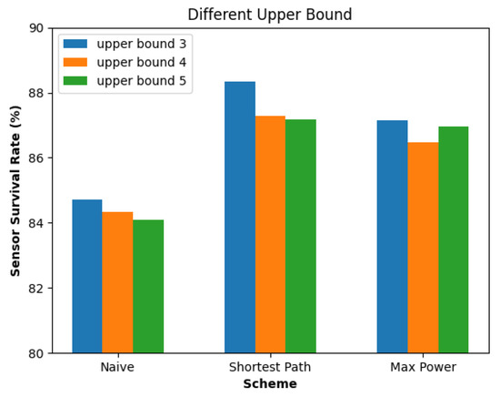 Impact of different upper bounds of the number of UAVs on the survival rate of sensors.