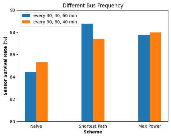 The average number of sensors on the green, red, and orange routes was 10.5, 8.0, and 11.5, respectively. We changed the interval of buses based on the average number of sensors on each route. Moreover, we exchanged the intervals of buses on routes 2 and 3 because there were more sensors on route 3. Figure 5 shows the effect of different bus intervals. The results indicate that the exchange did not affect the survival rate of sensors.