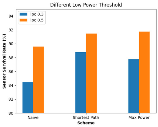 Finally, we increased the lower bound of the power used by the UAV to charge the sensor and found that it would have more impact on the sensor survival rate, as shown in Figure 6. The results indicate that the survival rate of sensors with an of 0.5 is higher than that with an of 0.3 by 3–5%. When the is lower, it can result in sensors not being charged even if buses pass by the sensor. If the arrival times of buses have wide intervals, the sensor may not be charged by the UAV in a timely manner. If only one bus route passes by the sensor, the would have a higher influence on its survival rate. Therefore, increasing the value can increase the fault tolerance of the WRSN networks.
