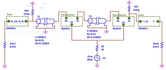 The structure diagram of an SPUT in longitudinal vibration is shown in Figure 1. From Figure 1, it mainly includes front mass, back mass, metal electrodes and a piezoelectric ceramic stack with a prestressed bolt. By using one-dimensional wave and cascade theory, the PSpice model of SPUTs in longitudinal vibration was established in [24], as shown in Figure 2. The specific illustration of the PSpice model of SPUT was given in [24]. It should be noted that the effect of a prestressed bolt on the electromechanical characteristics of SPUT cannot be considered in the established PSpice model of SPUT. The metal electrodes are modeled by means of the lossless transmission line. The parameters of the lossless transmission line can be calculated by the following Equations (1) and (2) [25,26]:
