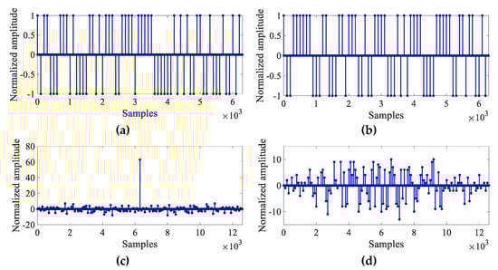 Kasami sequences include a small set and a large set, which stems from m-sequences. The detailed procedure was explained in [27]. The small set of Kasami sequences is chosen in this paper, resulting from its better cross-correlation features than that of the large set. In general, the small set can be expressed as , where is a non-negative even integer, indicates the number of sequences contained in the set, and is the length of each sequence in the set. In the case of periodic transmission of Kasami sequences, auto-correlation functions (ACF) and cross-correlation functions (CCF) can be represented as: