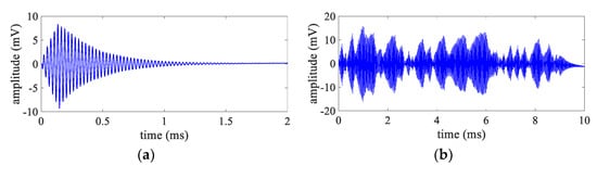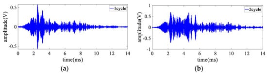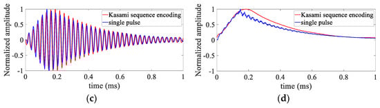 where represents the gain of SNR, and and indicate the amplitude of the received signals. From Figure 4a,b, it is shown that the amplitude of the vibration signal in the front mass is much larger than that of single pulse: about twice as much. According to Figure 4a,b, and can be obtained as 8.30 mV, 15.57 mV. Substituting these parameters into Equation (8), the can be obtained as 6.29 dB. Considering Figure 4c,d, after performing amplitude normalization, the waveforms from encoding excitation and single pulse are almost the same. There are subtle differences; the change trend is consistent according to the extracted envelopes under the two excitation signals above. A conclusion can be drawn that the encoding excitation based on Kasami sequences can be used to generate UGW, which is suitable for the rail detection.