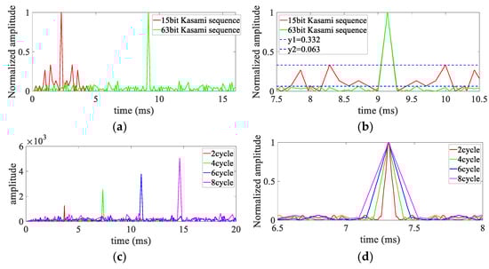 Based on the above analysis conclusions, it is easy to think whether the envelope width of the autocorrelation function of the Kasami sequence is closely related to the number of cycles of the carrier signal. Here, taking the 63-bit Kasami sequence as an example, the carrier signal adopts a sinusoidal signal with a frequency of 35 kHz, and the number of cycles is 2, 4, 6 and 8 cycles, respectively. The autocorrelation function envelopes of the Kasami sequence with different carrier cycles is analyzed, as shown in Figure 5c,d. From Figure 5c, as the number of carrier cycles increases, the peak value of the autocorrelation function envelope increases linearly. From Figure 5d, after normalizing the amplitude of the envelope, it is found that as the number of carrier cycles increases, the main lobe width of the autocorrelation function increases linearly. Therefore, under the premise that the carrier waveform is determined, the main lobe width of the autocorrelation function of the Kasami sequence is only related to the number of carrier cycles.
