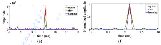 To analyze the influence of different carrier waveforms on the envelope of the autocorrelation function, this paper uses square waves, sinusoidal signals and sinusoidal signals modulated by the Hanning window as carrier signals. These signals are with a frequency of 35 kHz and five cycles. The specific analyzed results are shown in Figure 5e,f. From Figure 5e, it can be seen that the envelope peak value of the autocorrelation function corresponding to the square-wave signal under the same amplitude condition is the largest, which is followed by the sinusoidal signal, and the envelope peak value corresponding to the sinusoidal signal modulated by the Hanning window is the smallest. From Figure 5f, after the amplitude normalization of the above envelope, it is found that the main lobe width of the envelope corresponding to the sinusoidal signal modulated by the Hanning window is the smallest, and the main lobe width of the envelope corresponding to the square wave and the sinusoidal signal is approximately the same. To sum up, the main lobe width of the autocorrelation function envelope of the coded excitation is mainly determined by the number of carrier cycles and the carrier waveform, and the size of the side lobes is mainly determined by the number of coding bits.