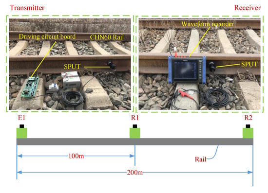 In order to verify the correctness of the above analysis results, an experimental platform based on the pitch–catch mechanism is built, as shown in Figure 6. The test uses 100 m and 200 m CHN60 rails, and the carrier signal selects a square wave pulse with a frequency of 35 kHz. From Figure 6, E1 represents the transmitting transducer, while R1 and R2 indicate the receiving transducer, respectively.