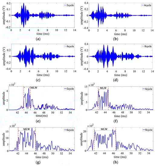 Based on the above experimental platform, the ultrasonic excitation signal encoded by the 15 bit Kasami sequence is tested in the rail with a length of 100 m, and the number of carrier cycles is selected as 2, 4, 6 and 8, respectively. According to Figure 7a–d, it can be seen that with the increase in the carrier cycle number, the received signal amplitude firstly increases, and then, it is almost unchanged. From Figure 7e–h, it is easy to find that as the number of carrier cycles increases, the main lobe width of the decoded signal envelope gradually widens, indicating that the main lobe width of the decoded signal envelope is directly related to the number of carrier cycles, which is consistent with the conclusion obtained by analyzing the main lobe of the autocorrelation function envelope of the encoding signal by Kasami sequence.