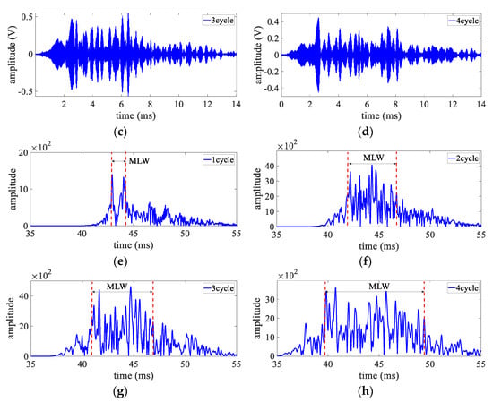 To verify the correctness of the peak detection method presented in this paper, the signals from Figure 10a,d are analyzed, and the analyzed results are shown in Figure 13. From Figure 13, the peak detection method presented in this paper without any threshold can accurately extract the peak of the received signal under different test distances. Compared to Figure 13c, the envelope of the detection signal from Figure 13g becomes wider, which is related to the dispersion effect of the UGW in the rail.