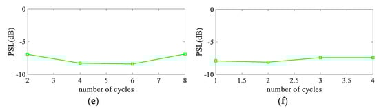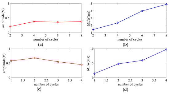 From Figure 7 and Figure 8, the values of the received signal amplitude, MLW and PSL under different bits and carrier cycles are obtained. The effect of carrier cycles on the amplitude, MLW and PSL is analyzed as shown in Figure 9. From Figure 9a,b, with the increasing of carrier cycles, the amplitude values are gradually increased and then almost unchanged, while the MLW are gradually improved. From Figure 9c,d, with the increasing of carrier cycles, the amplitude values first increase and then gradually decrease, while the corresponding MLW are gradually improved. Combined Figure 9e,f, it is found that with the increasing of carrier cycles, PSL presents minor changes. To summarize, the MLW is closely related with carrier cycles when Kasami sequences bits are unchanged, and the number of carrier cycles has little effect on PSL.