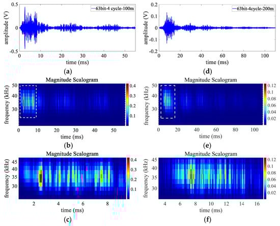 Subsequently, in order to analyze the time-frequency characteristics of the received signal above, continuous wavelet transform is used, and the specific analysis results are shown in Figure 10. From Figure 10c,f, it is shown that the energy of the received signal is mainly concentrated in the range of 30 to 45 kHz, where the energy is stronger in the range of 32.5 to 37.5 kHz. From the perspective of time, it mainly focuses on 0~15 ms, so we focus on analyzing the first 15 ms signal. When the sampling rate is 500 kHz, it is enough to analyze 7500 sampling points. Hence, the bandwidth of the bandpass filter in the peak detection algorithm is to be selected as 5 kHz (32.5–37.5 kHz), and the center frequency is 35 kHz.