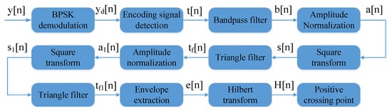 The processing flow of the adaptive peak detection algorithm given in this paper is shown in Figure 11, which mainly involves bandpass filtering, amplitude normalization, square transform, triangular filtering, envelope extraction and Hilbert transform. For the BPSK demodulation and encoding signal detection shown in Figure 12, the above processing can be realized according to Equations (6) and (7).