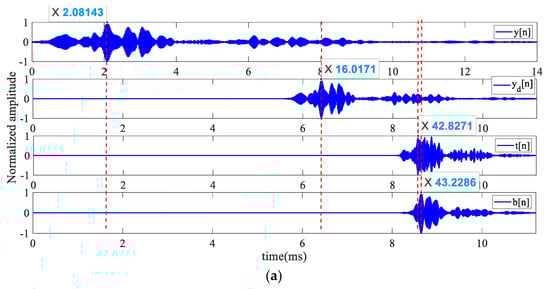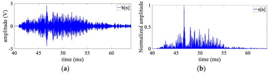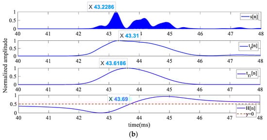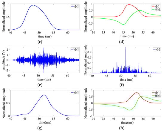 where represents the window width. It should be pointed out that the window width is generally equal to the main lobe width of . Then, the smooth envelope signal is obtained by processing according to Equations (14)–(16), and the Hilbert transform is applied to obtain a unique positive over-zero point to identify the peaks.