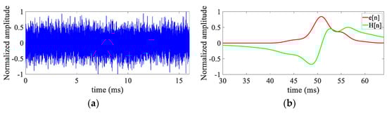 Subsequently, to analyze the anti-noise performance of the peak detection algorithm presented in this paper, Gaussian white noise with SNR = −20 dB is superimposed for the received signal at the test distance of 200 m, as shown in Figure 14. From Figure 14, it can be found that the characteristics of the received signal have been completely drowned by the noise, but after the peak detection process, the only positive crossing point corresponding to the envelope peak can still be obtained, which fully illustrates that the peak detection method presented in this paper has strong anti-noise performance and meets the requirements of in-service rail UGW detection.