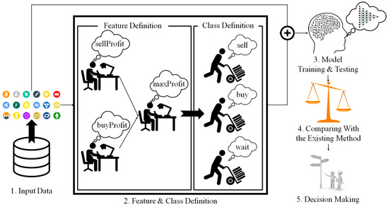 Figure 1 shows the overall approach of the proposed method. The output of our proposed method is calculated based on cryptocurrency price data. First, we calculate new input features such as sellProfit, buyProfit, and maxProfit through the collected data and the proposed equation to train the deep learning model. Classification groups are limited to the most common functions: “Sell”, “Buy”, and “Wait”. We classify groups based on calculated sellProfit, buyProfit, maxProfit, and our proposed criteria. These classes then become the final output in the deep learning model. Next, we trained and tested the deep learning model through collected data, proposed input features, and proposed classes. Through the evaluation criteria used in the experiment, we compared existing methods using the LSTM model with the proposed method [26,27]. Finally, we evaluated the performance of these methods in terms of these evaluation criteria.