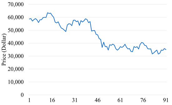 The feature sellProfit represents the profit that can be obtained when selling a specific amount of cryptocurrency. Figure 2 shows the daily price of Bitcoin over 88 days between 1 April 2021 and 30 June 2021. This graph shows that Bitcoin’s daily price continues to fall in the long run. According to a study by Ji et al., clients who trade stocks tend to sell if the price is predicted to continue to fall in the long run, as shown in Figure 2 [35]. Based on the results of this study, we propose Equation (1). The result of this equation is defined as sellProfit.