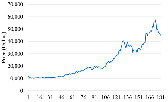 On the contrary, in Figure 3, the price of Bitcoin on 4 November 2020 is about $14,146. However, the price of Bitcoin on 5 November 2020 is about $15,587. We assume that we will sell or purchase one cryptocurrency. Assuming that the current date is 4 November 2020, if sellProfit is calculated through Equation (1), the value is −1441. However, if buyProfit is calculated through Equation (2), the value is 1441. Consequently, maxProfit has the same value as buyProfit because buyProfit is larger than sellProfit. Therefore, we can maximize profits when we purchase cryptocurrency rather than when we sell it.