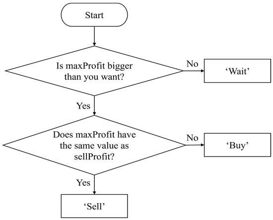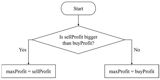 The feature maxProfit represents the maximum profit that can be obtained between sellProfit and buyProfit. Figure 4 shows the flow chart for calculating maxProfit. According to a study by Ji et al., clients who trade stocks tend to take specific actions after comparing the profits earned when purchasing stocks with the profits earned from selling [35]. Based on the results of this study, we propose a flowchart to obtain maxProfit. If sellProfit is greater than buyProfit, maxProfit is assigned the same value as sellProfit. This means that profits can be maximized when we sell. On the contrary, if buyProfit is greater than sellProfit, maxProfit is assigned the same value as buyProfit. This implies that profits can be maximized when units of cryptocurrency are purchased. Brief definitions of the three input features defined in this section are shown in Table 2.