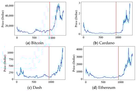 The cryptocurrencies considered in this study primarily include BTC and ETH, which are currently the most popular cryptocurrencies. Furthermore, based on data since January 2018, as the popularity of cryptocurrencies began to increase, we considered a total of six cryptocurrencies, including ADA, DASH, LTC, and XMR, which have advantages in terms of security, scalability, and speed. Moreover, the input features used in the experiment included average price (P), opening price (O), highest price (H), lowest price (L), and trading volume (V). The input features were obtained from Investing.com (access date: 5 April 2022, website: https://www.investing.com/) [36].