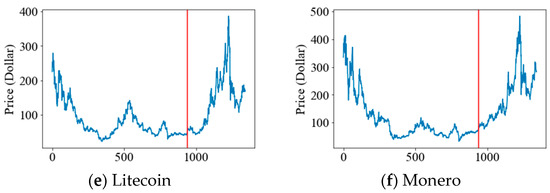 Price fluctuation graph of 6 major cryptocurrencies per each day. (a) Bitcoin; (b) Cardano; (c) Dash; (d) Ethereum; (e) Litecoin; (f) Monero.