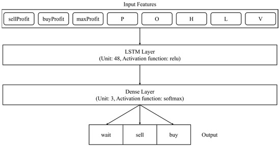 The study by Nelson et al. found that the action recommendation model showed the highest performance when using LSTM among LSTM, MLP, RF, and a pseudo-random model [26]. The study by Sanboon et al. also found that the action recommendation model showed the highest performance when using LSTM among LSTM, SVM, RF, MLP, KNN, Logistic Regression, and a Decision tree model [27]. Therefore, we used LSTM to determine experimentally whether the proposed model affected actual performance. Input features include P, O, H, L, and V by default, and we compare the extent to which performance differences occurred when sellProfit, buyProfit, and maxProfit were added as input features.