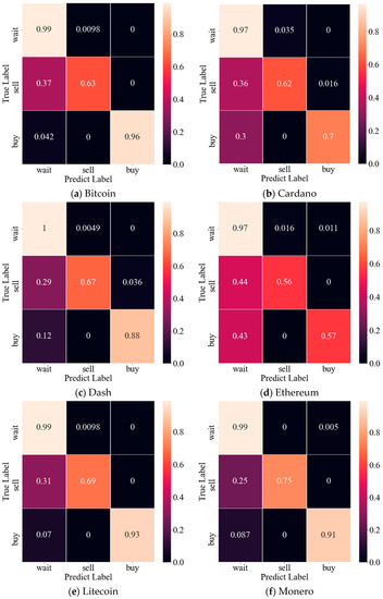 Confusion matrix of each cryptocurrency’s class. (a) Bitcoin; (b) Cardano; (c) Dash; (d) Ethereum; (e) Litecoin; (f) Monero.