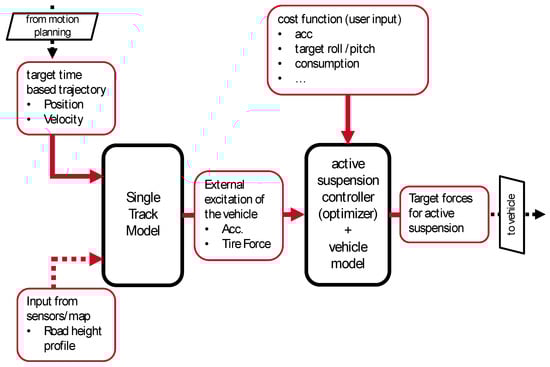 In the first step, a single-track model is used to derive the external excitation of the vehicle. Latter is determined through the future (target) trajectory and road excitation, which can be obtained using environment sensors such as a stereo camera or LIDAR, or out of a digital map. As the control values are highly dependent on the inputs, the input signals have to be checked for plausibility to deactivate the controller in case of, e.g., discontinuities. The preview-information of external vehicle excitation is then used as input for the active suspension controller. Inside the active suspension controller, an optimization problem is set up to find the four optimal target forces (one for each corner), which lead to the desired optimal vertical motion. The resulting optimization problem is given in Equation (15):