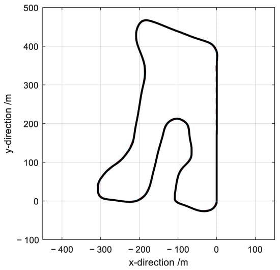 The narrowest curve occurs after a traveled distance of 1685 m with a curvature of κ = 0.0835 1/m, which corresponds to a curve radius of 12 m. In this and in the following figures, the traveled distance s is defined from the starting position x = y = 0 (see Figure 4), where the vehicle starts in a positive y-direction with an initial velocity of v = 0.
