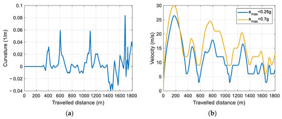 The test track has a length of 1811 m. Its curvature values for each location are depicted in Figure 5a.