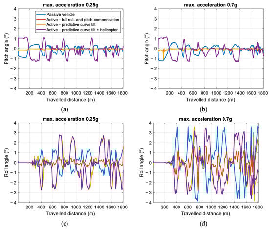 Figure 6 shows the vehicle roll- and pitch angle for the two cases “max. acceleration 0.25 g” and “max. acceleration 0.7 g”.