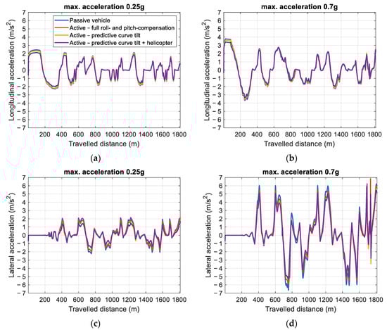 All simulation runs were carried out with the same vehicle model. The passive vehicle has conventional springs, dampers, and anti-roll bars. For the simulation of the active variants, the anti-roll bars are removed as the required forces for roll compensation are applied by the active system. The simulation results show that the passive vehicle compensates squat well while there is a brake dive of 0.5° in both cases. All the active variants do overcompensate the pitch motion. Both “full roll-and pitch compensation” and “predictive curve tilt” do not penalize longitudinal acceleration in the cost function, however, squat motion is slightly overcompensated (positive pitch angle while accelerating). Brake dive is fully compensated. “Predictive curve tilt and helicopter” leads to pitch angles of up to 2° for both accelerating and braking. Therefore, resulting longitudinal acceleration can be reduced.