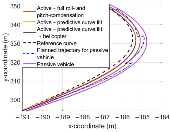 Thus, the trajectory planner plans a new trajectory, which is no longer on the reference curve. This interactively replanned trajectory is also depicted in Figure 8 as a dotted line. Here only the currently desired position of the trajectory planner is plotted, but not any planned positions for the future. The replanning events occur as steps in the trajectory. With the active suspension system, the vehicle motion is supported in a way that enables a narrower curve radius satisfying the lateral position threshold. In this case, no replanning takes place, and the planned trajectory is always on the reference curve. Obviously, the effect is stronger the more the vehicle body is tilted towards the inner side of the curve, so predictive curve tilt has a stronger positive effect than roll compensation.