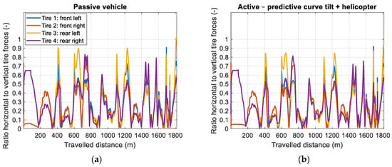 Ratio of horizontal and vertical tire forces (exploitation of friction force potential) for the scenario with max. acceleration of 0.7 g for (a) the passive vehicle and (b) the active suspension with predictive curve tilt and helicopter.