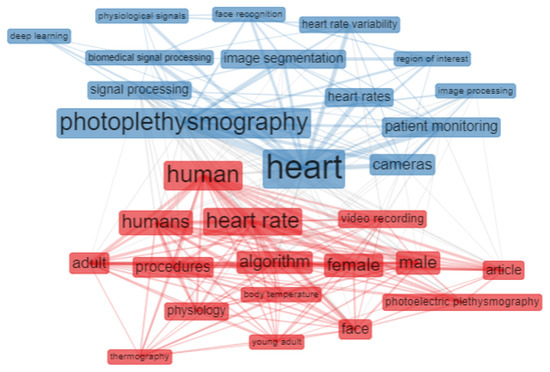 This potential search phrase was then fed into the Biblioshiny tool for bibliometrics analysis. As shown in Figure 1, the co-occurrence network of terms revealed “PPG”, “heart”, and “heart rate” as the most key elements of the two clusters created.