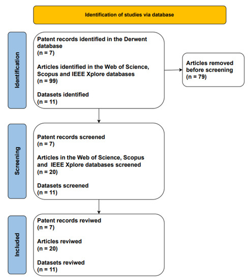 The search was conducted in May 2021, and we screened seven patent records, eleven datasets, and twenty articles after applying exclusion criteria.
