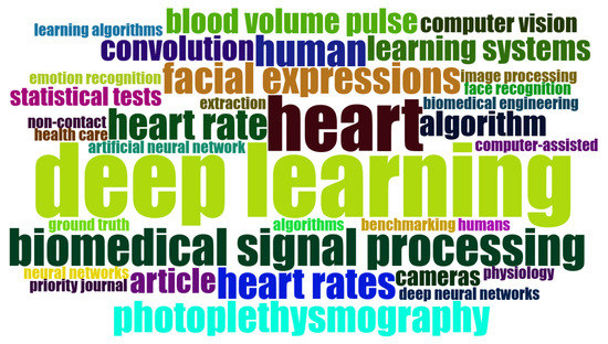 Figure 3 depicts the extracted word cloud from the reviewed articles, indicating which terms are most related to the subject. The terms with the greatest incidence numbers are connected to cardiac monitoring using cameras that display a human face image. Other terminology used to describe comparable approaches include image segmentation, face recognition, image and signal processing, independent component analysis, and others.