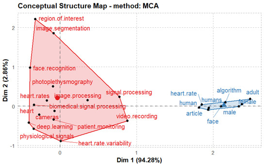 The conceptual structure of the reviewed articles is shown in Figure 4. This structure covers almost 97% of the primary subjects mentioned in the articles. The clusters represent how ideas are connected; the closer they are, the stronger the association. There is a cluster of topics about techniques and another about applications. Figure 4 demonstrates the density that the technical terms in Figure 1 have in relation to the terms that refer to the object of study.