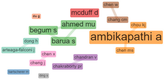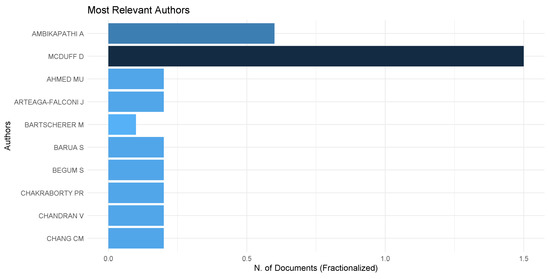 Figure 5 illustrates the writers who had the biggest impact on the research subject. Among them, the authors Ambikapathi, A. and McDuff, D. stand out as having the greatest relevance among those selected for this review. It can be seen that although McDuff, D. shows the highest relevance in Figure 5, Ambikapathi, A. shows the largest name in Figure 6, and therefore, shows a higher impact in the thematic group.