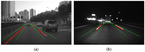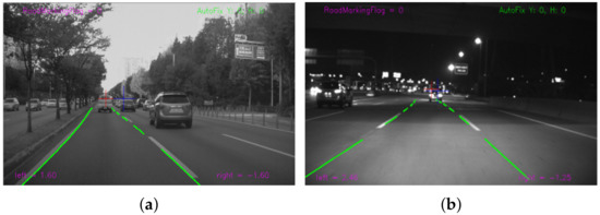- Lin, Q.; Han, Y.; Hahn, H. Real-time lane departure detection based on extended edge-linking algorithm. In Proceedings of the 2010 Second International Conference on Computer Research and Development, Kuala Lumpur, Malaysia, 7–10 May 2010; pp. 725–730. [Google Scholar]